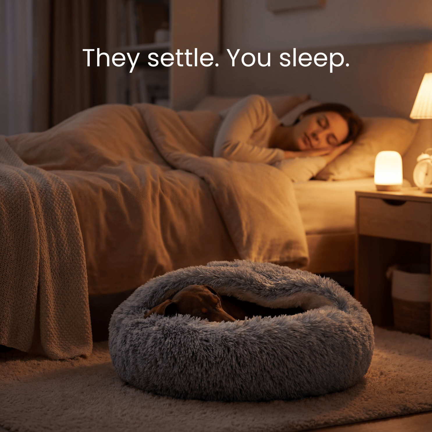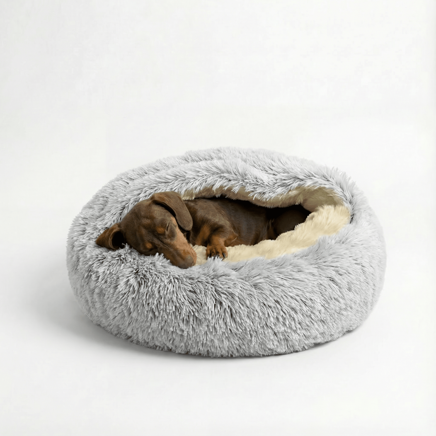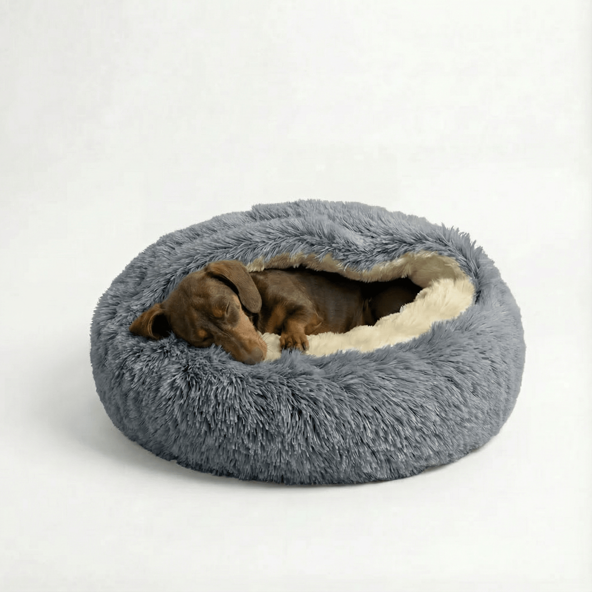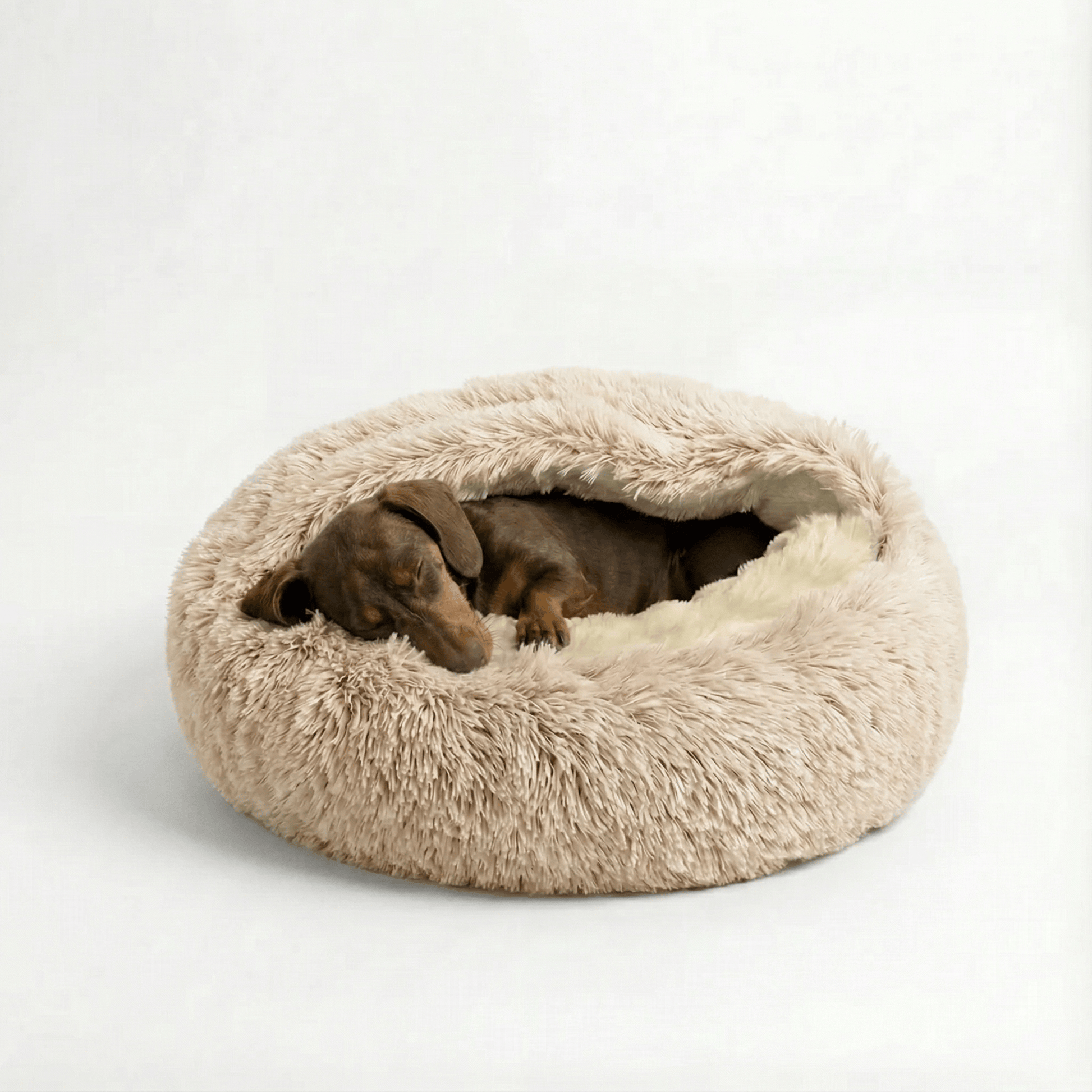 The Den's structured hood stays put. Your dog can burrow in, adjust, and re-settle on their own — without waking you.